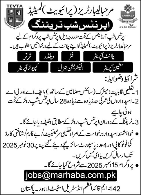 - Apprenticeship Training in Marhaba Laboratories Pvt Ltd Lahore 2025 November