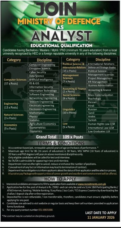 Ministry of Defence Jobs 2025 – Apply Online for Analyst (109 Posts)