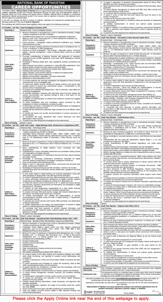 Recent / Current / Fresh / New / Latest National Bank of Pakistan NBP Jobs 2026 Apply Online Audit Group Advertisement in Daily Newspaper on Sunday 25-January-2026 ACCA / CA / CISA / CISM / MBA / Master’s Fraud Investigation Executive , Audit Team Leader , Credit Reviewer Banking Jobs in NBP 2026 Pakistan www.sidathyder.com.pk/careers Apply Online Finance , Banking , Audit , Risk Management , Cyber Security Bachelor’s in Business Administration , Master of Business Administration AVP , OG-I , OG-II , Assistant Vice President Sidat Hyder Morshed Associates NBP Careers Karachi / Lahore / Islamabad Public Sector Bank Jobs 2026