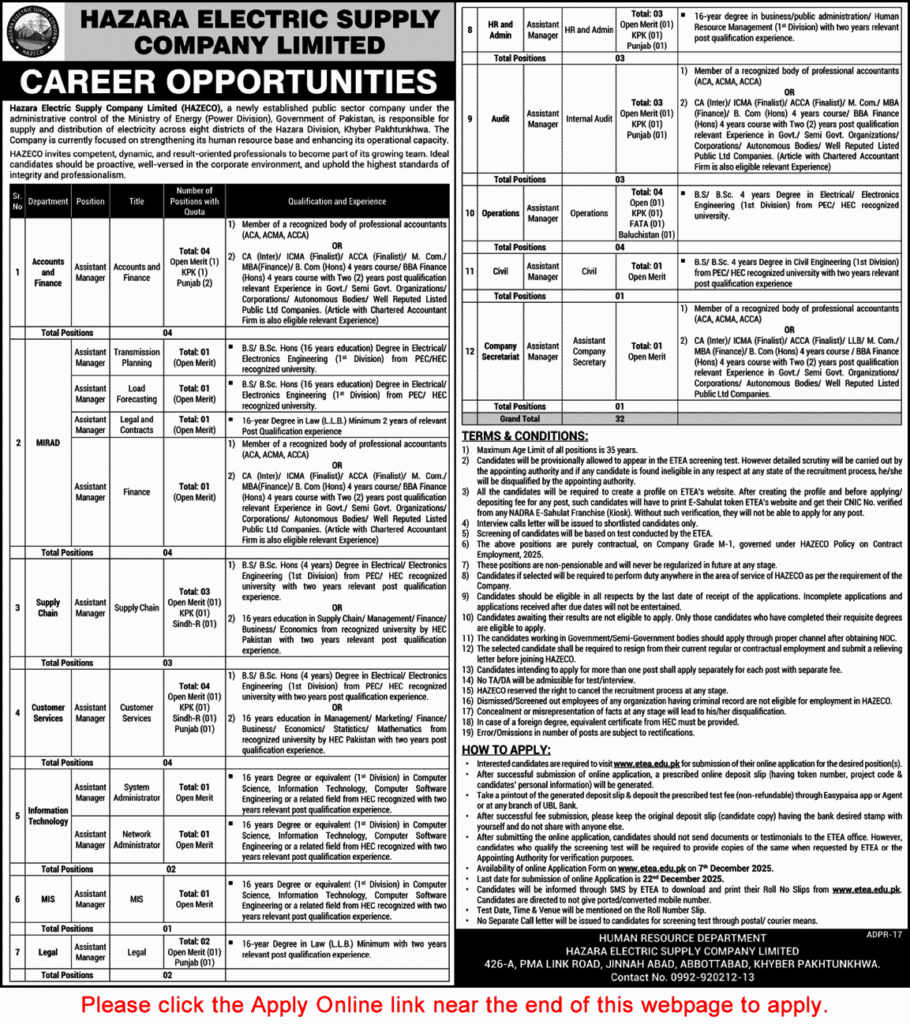Assistant Manager Jobs in HAZECO December 2025 WAPDA Apply Online Hazara Electric Supply Company Latest